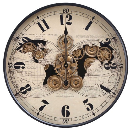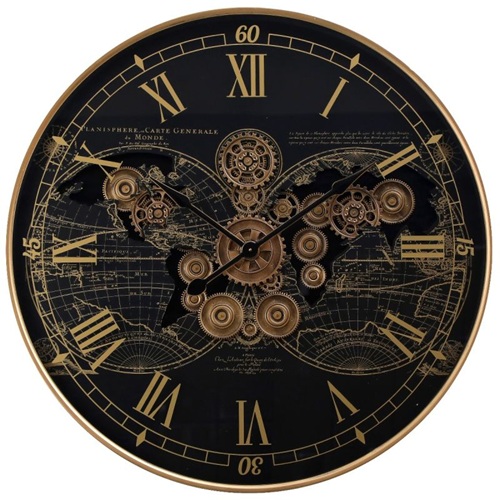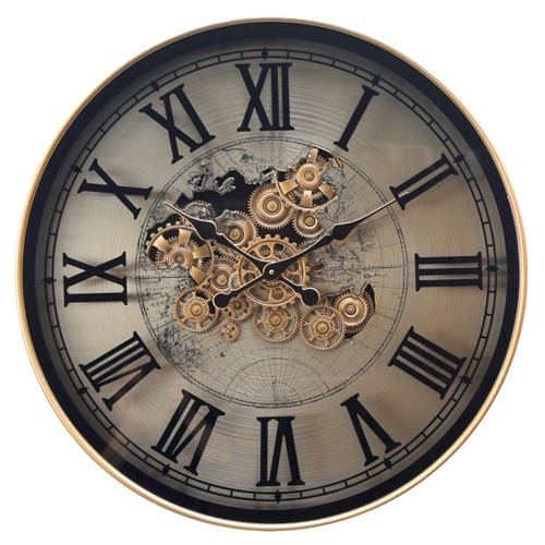 Hang this 80cm clock about 6 to 8 inches above the sofa back. Centre it. The Atlas Map collection design celebrates exploration with continents cut into the metal face. Moving cogs add depth and motion behind the map.
