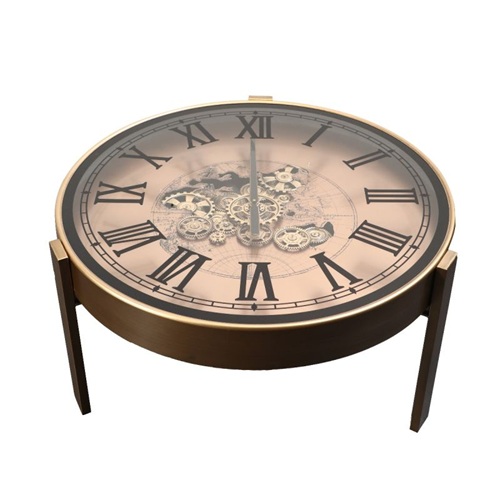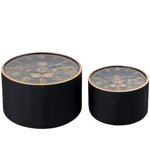 Two matching clocks on side tables flanking a fireplace or big window. Each one functions as both a table and a timepiece with moving cogs underneath the glass surface.