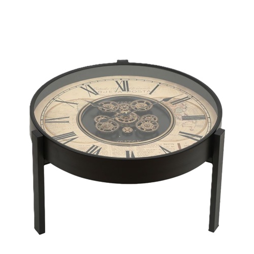 A coffee table that tells time. This 2-in-1 piece sits at the perfect height between sofas or in front of a sectional. The world map cutout shows through the glass top while gears turn underneath. The dual-battery system keeps everything running smooth.
